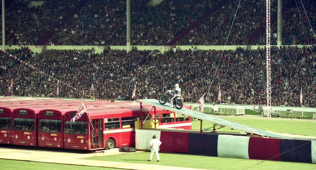 Sin lugar a dudas, Evel Knievel fue el primer gran “stuntman” de la historia. Nacido en 1937 en Montana (Estados Unidos), se hizo muy famoso por sus grandes hazañas sobre una moto en las décadas de los años 60 y 70 del siglo XX. A pesar de haber transcurrido cerca de 20 años desde su muerte, Evel Knievel todavía es un tipo muy recordado. Está claro que fue un adelantado a su tiempo, “una estrella” que en 1975 fue capaz de llenar el estadio de Wembley con 90.000 espectadores que acudieron para ver una de sus gestas más increíbles. Aunque solo iba a dar un salto, todos los que acudieron ese día al recinto londinense tenían claro que verle “volar” iba a merecer la pena. En aquella cita Robert Craig Knievel logró saltar por encima de 26 autobuses colocados de manera transversal al sentido de su gran “vuelo”·.