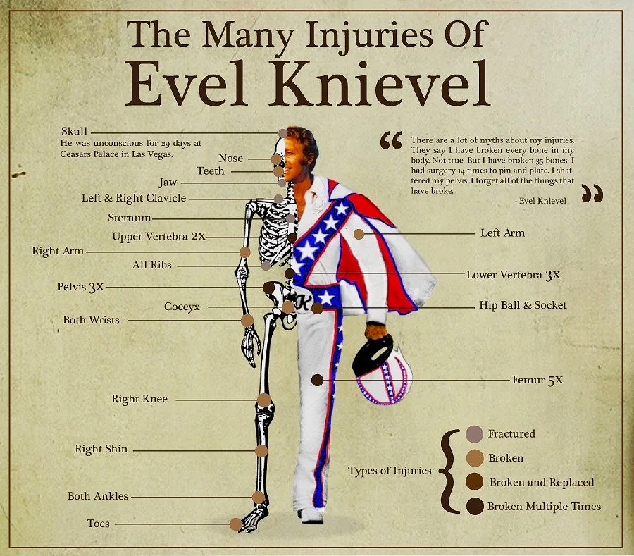 Eso sí, en la recepción, su moto rebotó y le descabalgó, fracturándose la pelvis en la caída. Pero las lesiones no parecían asustarle lo más mínimo, pues cinco meses más tarde realizó un salto similar en Ohio (Estados Unidos), pero esta vez lo completó sin mayores problemas. Además, recorrió casi 50 metros por el aire, quedando así registrado como su salto más largo. A lo largo de su carrera profesional, que abarcó desde 1965 hasta 1980, realizó cerca de 300 grandes saltos en espectáculos, de los cuales 19 terminaron en caídas graves con lesiones de importancia.