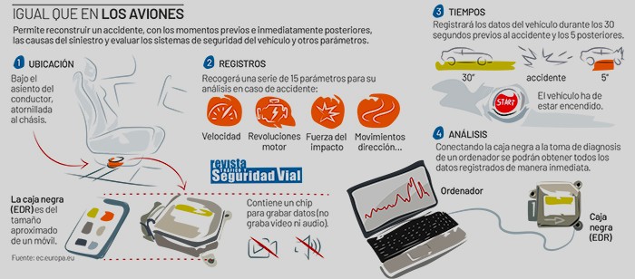 Debido a sus funciones, este dispositivo es conocido popularmente como “caja negra”, aunque a diferencia de la que se utiliza en el mundo de la aviación, no graba vídeo ni audio. Está desarrollado con la idea de reconstruir y comprender mejor los siniestros en los que se puede ver involucrado un vehículo, pero sin invadir la privacidad de las personas que van en él. En inglés, las siglas EDR significan “Event Data Recorder”, que se puede traducir al español como “grabador de datos de evento”.