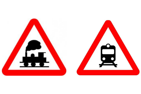 Paso a nivel sin barrera: la señal de paso a nivel sin barrera, también denominada P-8, es una señal triangular con los bordes en rojo y el fondo blanco, que en su interior incluye el pictograma de una locomotora clásica de vapor. Se sitúa a 200 m de distancia. El Reglamento General de Circulación ha informado recientemente de la llegada de nuevas señales y una de ellas es una P-8 renovada, en la que en su interior aparece un tren más moderno visto de frente. La nueva señal ya se está instalando en algunos lugares y va a reemplazar gradualmente a la anterior.