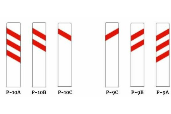 Balizas o señales de aproximación: suelen ser tres y están colocadas a distinta distancia del paso a nivel. Son señales verticales con el fondo blanco y que incluyen una, dos o tres líneas diagonales pintadas en rojo. La primera en aparecer incluye tres líneas e indica que el paso está a 200 m. La siguiente, marcada con dos líneas, advierte que quedan 150 m para el paso. Y la tercera, con una sola línea, avisa de que solo faltan 50 m. Estas se conocen también como señales PAC: Proximidad (3 líneas), Aproximación (2 líneas) y Cercanía (1 línea). Dependido de si están a un lado o al otro del acceso al paso a nivel, de denomina P-9 o P-10.