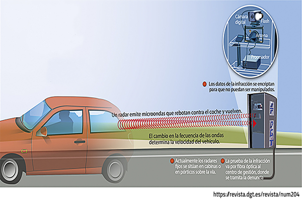 Como su denominación pretende indicar, un radar fijo es un dispositivo llamado cinemómetro que controla la velocidad en un punto fijo de una carretera. A su lado y vinculado a él, además de un procesador, cuenta con una cámara que hace fotos a los vehículos que superan la velocidad permitida. El cinemómetro funciona de manera automática y puede utilizar ondas de radiofrecuencia o láser infrarrojo para medir la velocidad. Cuando las ondas chocan con un vehículo y rebotan, su frecuencia se modifica. Este cambio, conocido como efecto Doppler, es utilizado para calcular la velocidad. Si es mayor a la permitida, en el momento la cámara hace una foto del vehículo y, a través de fibra óptica, la envía junto a los datos de la infracción a un centro de gestión.