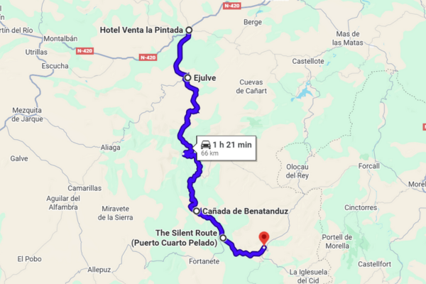 La Ruta del Silencio o “The Silent Route” es un tramo de 66 km de la carretera A-1702 que discurre por las comarcas turolenses de Andorra-Sierra de Arcos y del Maestrazgo. Concretamente une la Venta de la Pintada en Gargallo con el Puerto de Cuarto Pelado poco antes de llegar a Cantavieja. Discurre por el este de la provincia de Teruel, cerca de los límites con la de Castellón y, dependiendo de dónde procedamos, podemos empezar desde la Venta de la Pintada, situada más al norte, o desde Cantavieja, localidad situada poco antes del Puerto de Cuarto Pelado y ubicada más al sur.