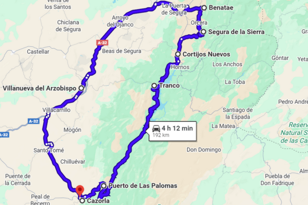 En este caso proponemos una ruta circular con salida y llegada a la localidad de Cazorla, un pueblo serrano con recuerdos islámicos, como demuestran sus calles desordenadas y pequeñas plazas humildes El itinerario marcado discurre íntegramente por el noroeste de la provincia de Jaén, visitando una buena parte del parque natural. Comienza por la A-319 desde Cazorla hacia el puerto de las Palomas, una carretera muy sinuosa trazada entre campos de olivos. La misma A-319 nos lleva hacia el norte bordeando el Embalse del Tranco de Beas formado por el río Guadalquivir. Más adelante tomamos a la izquierda la A-317 que atraviesa Cortijos Nuevos y Carrasco. El otoño ofrece en esta zona una gran belleza debido a la variedad de colores de su masa forestal y a los berridos de los venados que reverberan con las montañas. Después nos dirigimos hacia Segura de la Sierra por la JV-7032, una zona con muy buenas carreteras, ideales para disfrutar a los mandos de una moto. En Orcera la carretera cambia a J-70309 y por ella continuamos hasta Benatae, localidad en la nos desviamos hacia la JV-7034, que nos lleva a la A-310 y A-32, hasta encontrarnos con Villanueva del Arzobispo, Villacarrillo y Calleruela. En este pueblo continuamos por la A-6204 hasta entrar de nuevo en Cazorla.